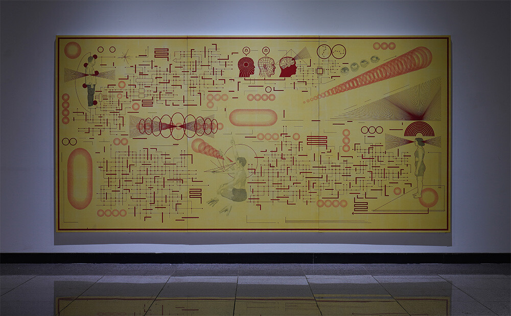 박건, 환생회로도, 장지에 괴화염색, 경면주사, 연필, 194x397.5cm, 2024
