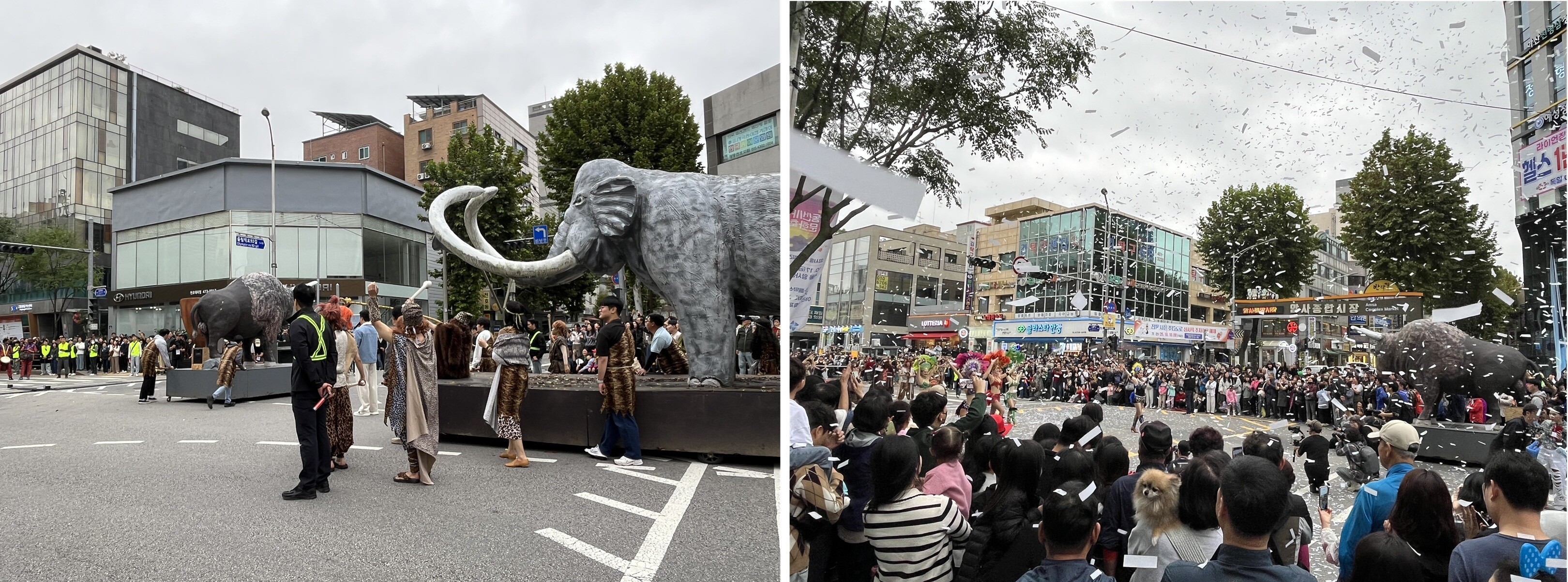 올해는 1925년 선사유적지가 발견된 지 100주년이 되는 해다. 코로나19 팬데믹 이후 퍼레이드가 재개되는 첫 해이기도 하다. 선사문화축제는 10월 17일부터 19일까지. 나는 퍼레이드가 진행되는 날짜와 시간과 장소를 미리 적어 두고(10월 18일 토요일 오후 4시) 30분 전부터 퍼레이드 기점인 신암초등학교로 가 기다렸다. 선사인 분장을 한 사람들이 거리 가운데서 춤을 추고 있었고 자리를 잡고 잠시 서 있자 곧 부족 소개가 시작되었다. 강동구에 속한 모든 동을 물, 불, 흙, 바람 네 개 부족으로 나누어 동 이름을 호명하면 역시 각자 해석한 선사인 복장을 입은 축제 참여자들이 춤을 추며 등장하였다. 사이사이 맘모스며 코뿔소며 여전히 이름 모를, 주작을 닮은 새와 같은 거대 동물 모형들이 등장하기도 했다. 삼바 축제 복장을 한 사람들과 젬베 공연팀과 군악대는 행렬 맨 앞에서 대기하였다. 그리고 곧 이 모두가 섞여 든 덩어리 같은 행렬이 행진하기 시작하였고 나는 그 뒤를 따랐다.