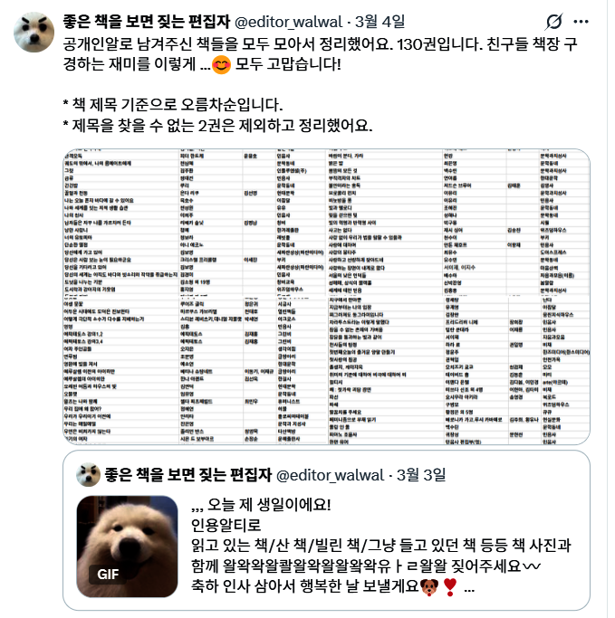 언젠가 제 생일에, 인용알티(코멘트를 달면서 재게시)로 읽고 있는 책이나 산 책을 한 권씩 알려달라고, 그걸 축하 인사 삼겠다고 트윗을 올린 적 있었어요. 140명 정도가 각자 가진 책 사진을 찍어 올리면서 축하해주셨고, 제가 그걸 다시 목록으로 정리해서 공유했었답니다. 종일 무척 감사하고 즐거웠던 기억이 나요. 책 설명이나 추천하는 말도 없이 그냥! 지금 쥐고 있던 책을 자랑하는 순수한 즐거움을 다 같이 나눌 수 있어서 기뻤습니다.