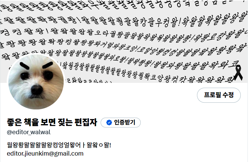 안녕하세요. 트위터(현 X)에서 ‘좋은 책을 보면 짖는 편집자 계정’(@editor_walwal) 쓰는 김지은입니다. 이름 그대로, 좋은 책을 발견하면 “왈왁왈왈쾅랄궝ㄹ쾅ㄹ쾅ㄹ쾅ㄺ쾅왁쾅” 짖는 소리를 트윗으로 쓰고 있습니다.