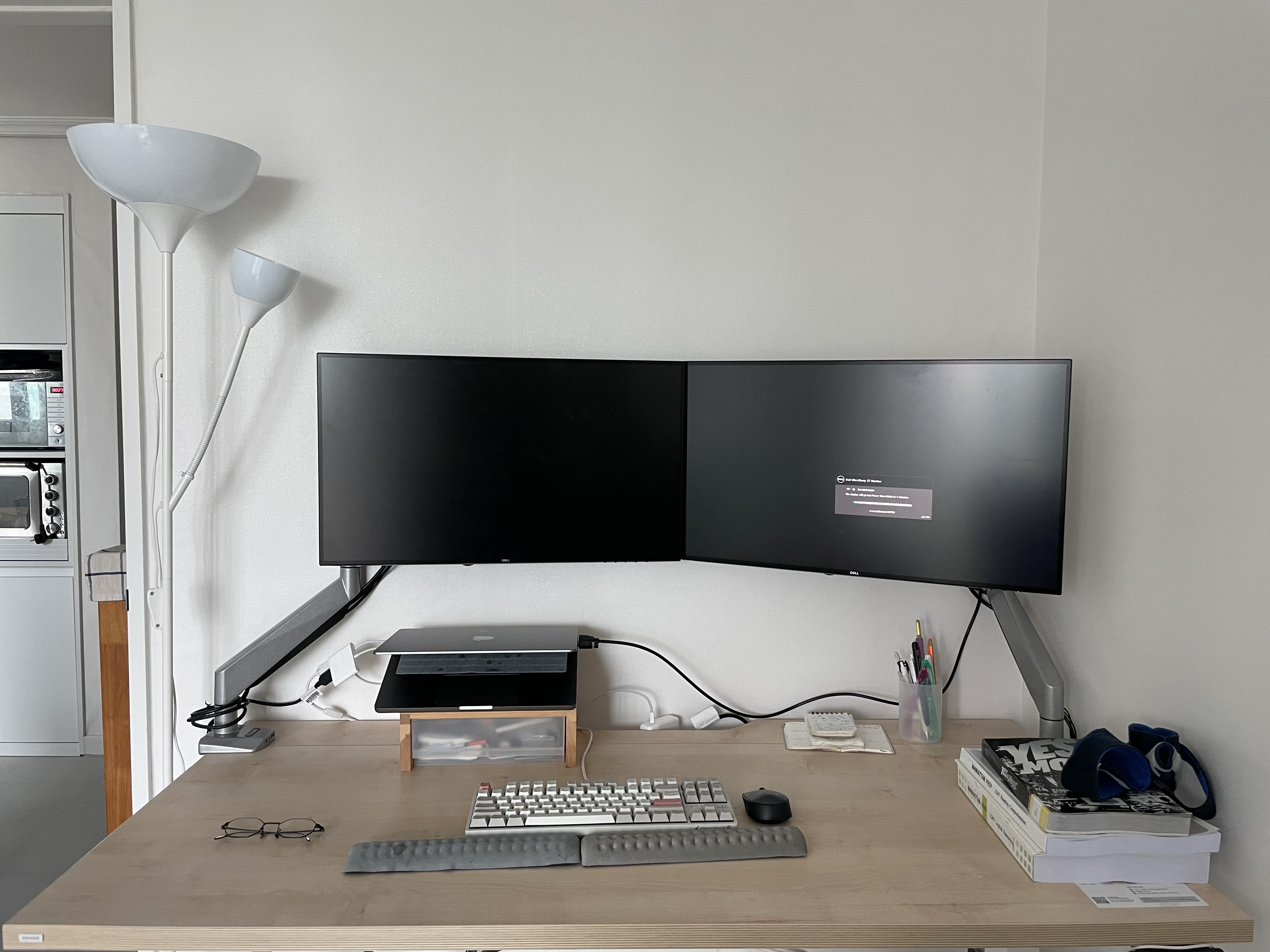 재택근무를 하는 탓에 작은 방을 서재 겸 사무실로 쓰고 있어요. 회사 업무도, 개인 용무도 이 방에서 봐요. 약 5년 간의 재택근무를 통해 저에게 딱 맞게 세팅해 둔 모니터암, 스탠딩 데스크, 사무용 메쉬 의자, 발 받침대가 저를 보조해 줍니다. 주말에 광화문이나 종로의 대형 프랜차이즈 카페를 전전하며 원고를 쓰기도 했지만 ‘최종_진짜최종_파이널_1’ 처럼 한숨이 너무 많이 나오는 퇴고작업은 머리를 쥐어뜯어도 되고 욕을 해도 되고 중간에 바닥에 드러누워도 되는 이 방에서 마무리했어요. 책에도 썼지만 허리 걱정 하느라 한자리에 진득하게 앉아서 일을 잘 못해요. 중간에 일어나기도 해야 하고 스트레칭도 해야 하는데 카페에서는 민폐일 수 있잖아요. 엉덩이 노동자 여러분들은 꼭 스탠딩 데스크 구비하셨음 좋겠어요. 기왕이면 모니터암도, 메쉬 의자도…