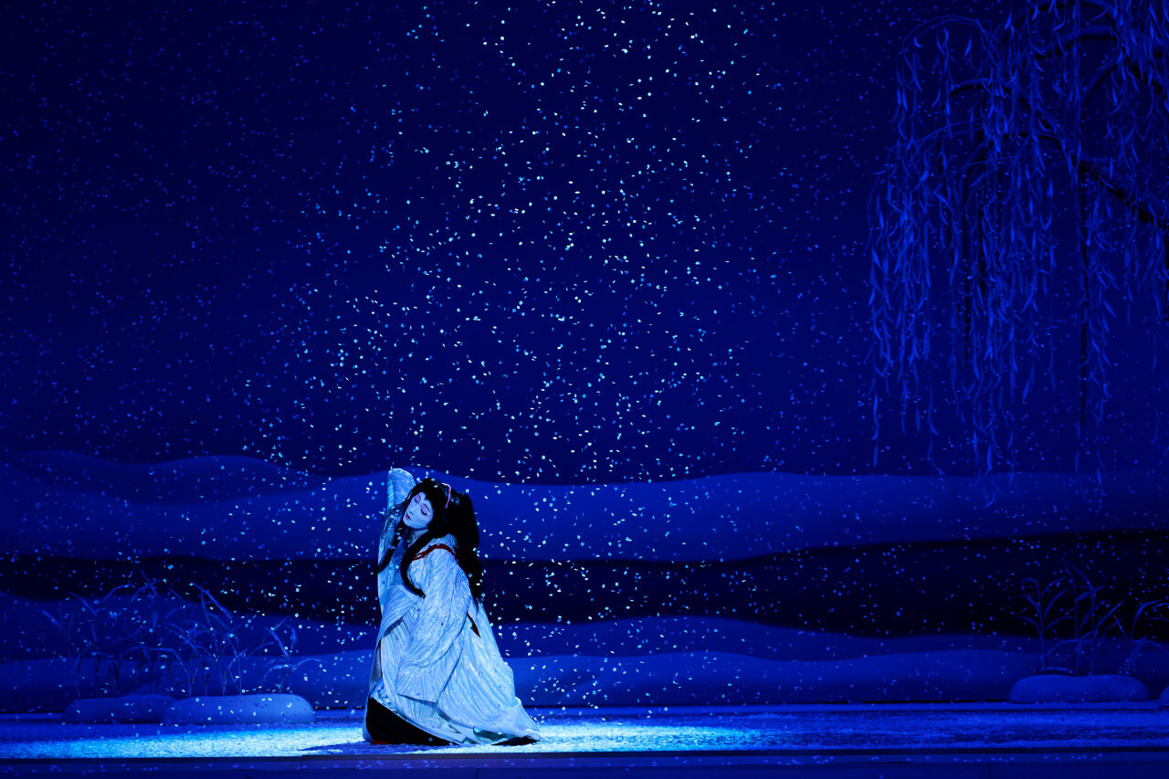 영화의 첫 장면은 언제나, 언제나, 언제나 반복된다. 단순히 똑같은 일이 생긴다는 뜻에서가 아니라 캐릭터들의 성격적 특징(약점) 때문에 상징적으로 같은 장면이 끌려나온다고도 할 수 있을 것이다. 〈국보〉에서는 특히 그렇다. 밖에는 눈이 펑펑 내리는 가운데 사람이 가득 들어앉은 일본 가옥의 넓은 연회석이 보인다. 창틀과 문틀은 착실하게 무대를 강조하는 ‘스크린’의 역할을 한다. 바깥이 무대일까, 안쪽이 무대일까. 이 장면을 보는 사계절이 살벌할 정도로 뚜렷한 한국의 관객에게는 그저 눈 내리는 어느 날이지만, 이곳은 나가사키다. 한겨울에도 포근한 날씨인. 소설의 첫 문장에서 나가사키에 흔치 않은 큰눈이 내렸다고 언급하는 것은 농담이 아니다. “마치 무대에 흩날리는 종이 꽃가루처럼”1 비현실적으로 큰 눈이 내렸다. 이 종이 꽃가루같은 눈을 키쿠오는 앞으로 평생 반복해 떠올리게 될 예정이다. 흔치 않은 사건(나가사키의 폭설)이 트라우마적 사건(아버지의 죽음)과 강하게 연루된 이미지로 새겨졌기 때문이다. 이날 키쿠오는 〈세키노토(국경의 관문)〉라는 가부키극의 여자 등장인물 스미조메를 사람들 앞에서 연기했다. 문밖에는 함박눈이 내리고, 실내의 무대에는 만발한 가짜 벚나무가 서 있다. 죽기에 딱 좋은 날씨다.
