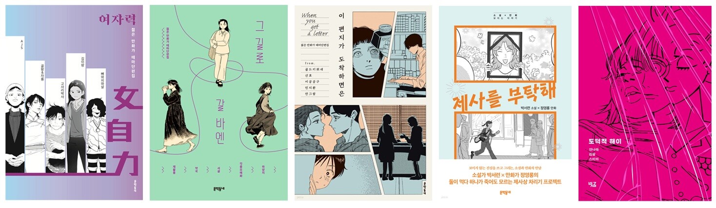 하여튼 그런 와중에도, 그러니까 웹툰이 주가 된 한국 만화 시장에서 출판 만화를 그리는 사람도 읽는 사람도 찾기 힘든데 처음 보는 편집자가 대뜸 연락을 해와 출판 만화를 그려달라 말하는 그런 얼토당토않은 ‘와중에도’ 기적 같은 분들이 계셨고 덕분에 귀한 원고를 모을 수 있었다. 그렇게 ‘젊은 만화가 테마단편집’이라는 이름으로 3년 동안 세 권의 앤솔러지 『여자력女自力』 『그 길로 갈 바엔』 『이 편지가 도착하면은』을 출간했다. 소설과 만화, 두 분야의 각각 다른 매력과 연출 방식으로 한 세계관을 공유해 이야기를 만드는 『제사를 부탁해』와 같은 책도 출간했다. 마찬가지로 앤솔러지인 『도덕적 해이』는 같은 주제를 두고 만화를 그리는 것은 ‘테마단편집’ 시리즈와 비슷하지만 ‘읽는 이로 하여금 찝찝하고 불쾌하고 불편하게 만드는 이야기’라는 좀 더 구체적인 의미와 타깃층을 설정했던 단편집이다. 개인적으로 이 만화에 실린 단편들은 나의 깜냥을 짓밟은 과히 위대한 명작들이라 생각한다. 아무도 내게 출판 만화책 내라고 시키지 않았는데 이런 걸 했구나…라는 생각이 들지만 한참 부족하다는 생각이 더 크다. 나는 연재가 가능한 만화 잡지를 보유하고 있는 만화 전문 출판사의 편집자가 아니다 보니 더 많은 출판 만화를 하기에는 환경이나 여건이 어쩔 수 없이 완전하지는 않았던 것 같다. 그리고 순전히 내가 갖고 있는 기술, 능력, 시야 등에도 종합적으로 아쉬움이 남는다. 그건 지금도 마찬가지고 아마 이 일을 하는 동안엔 계속 그럴 것이다.