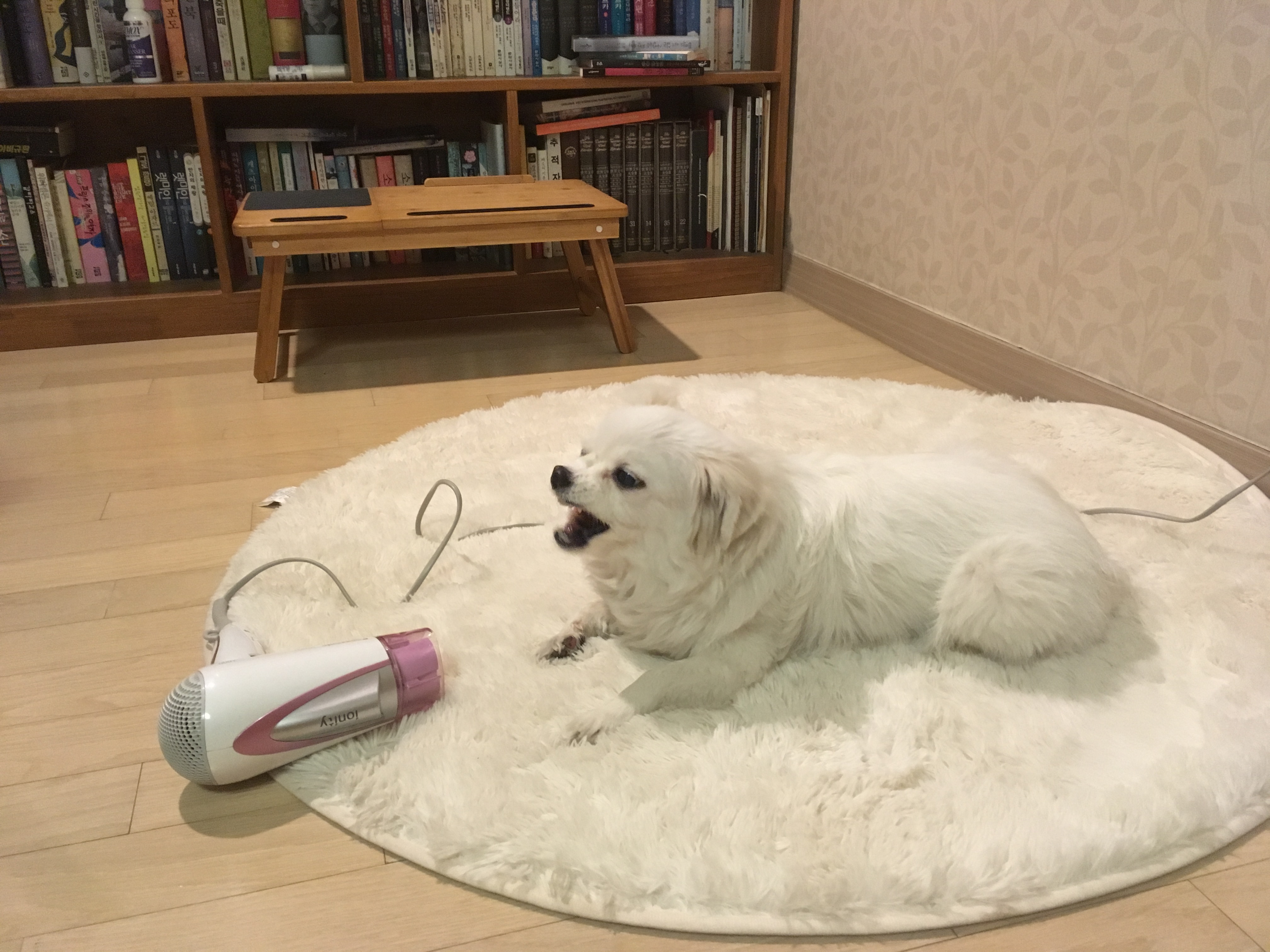 나의 총명한 두 번째 개 타티는 겨울철 산책이 끝나고 나면 헤어드라이어기 앞에 자리 잡고 나를 올려다보곤 했다. 언 몸을 녹이고 싶으니 어서 따뜻한 바람을 내놓으라는 의미였다. 하루는 차를 타고 외출했다 들어온 날도 당당히 온풍을 요구해 나의 핀잔을 사기도 했다. 헤어 드라이어에 눈길이 머문 김에 오늘은 아로하를 목욕시키기로 한다. 집집마다 고유한 ‘멍빨’의 절차가 있을 텐데 내 경우 다섯 장 가량의 수건과 드라이어, 빗, 귀 세정제를 ‘건조 구역’에 깔아놓는 일이 첫 단계다. 접이식 욕조를 받침대에 올리고 수온을 맞춘 다음 눈치껏 체념하고 귀를 내린 아로하를 영차 안아 올려 샤워 부스로 들어간다.
