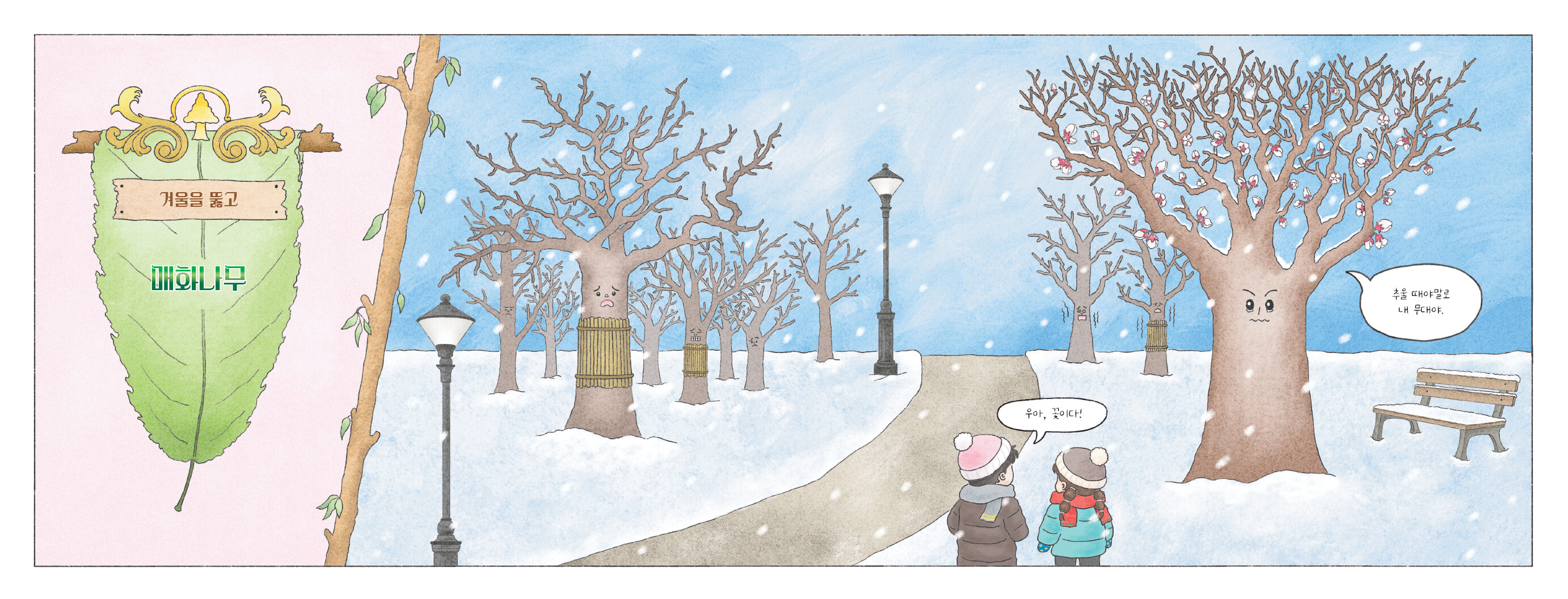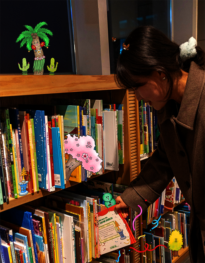 매화나무입니다. 원고 초안에서는 수상 후보 캐릭터들이 지금처럼 실존하는 나무의 이름이 아니라, ‘오푸른’과 같은 이름으로 등장했어요. 이후 원고를 수정하는 과정에서, 우리 일상에서 나무들이 얼마나 소중한 존재인지, 또 나무가 생태계에서 맡고 있는 중요한 역할에 초점을 두면서 인간사의 모습에 빗대어 볼 수 있도록 나무 캐릭터를 실제 존재하는 나무로 바꾸게 되었습니다.