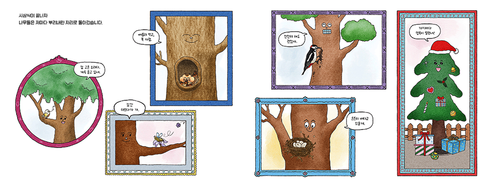 표지에 등장하는 나무들은 각 캐릭터의 성격에 어울리는 표정으로 표현했는데, 개인적으로는 은행나무의 표정이 특히 재미있게 느껴져 가장 마음에 들어요.