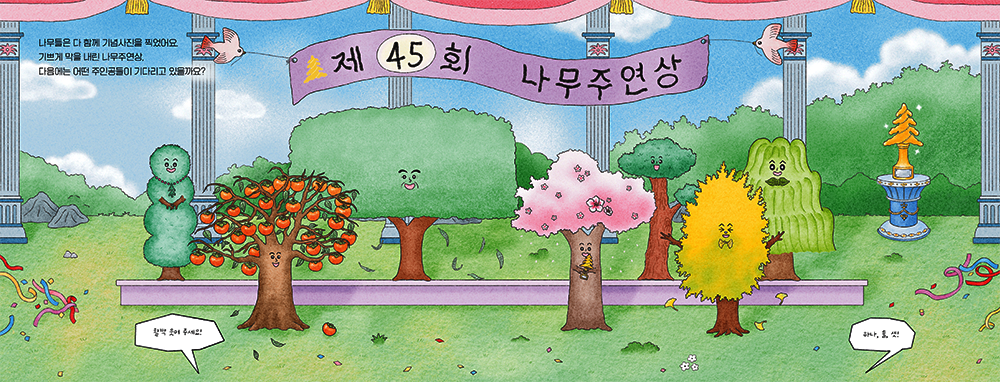 후보 소개와 나무들의 활약상이 펼쳐지는 장면은, 영화 시상식에서 수상 후보를 소개할 때 작품명과 배우 이름, 연기 장면이 함께 등장하는 화면 구성을 참고했습니다. 책에서는 왼쪽 페이지에 나무의 이름과 활약 내용을 담았고, 오른쪽 페이지에는 해당 나무의 모습을 보여 주는 방식으로 장면을 구성했습니다.